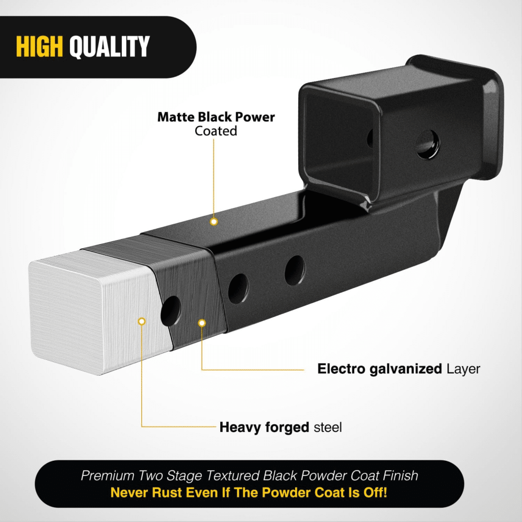 The hitch extension offers three adjustable lengths—5 inches, 7 inches, and 9 inches, giving you flexibility to increase clearance between your vehicle and trailer or hitch-mounted accessories.