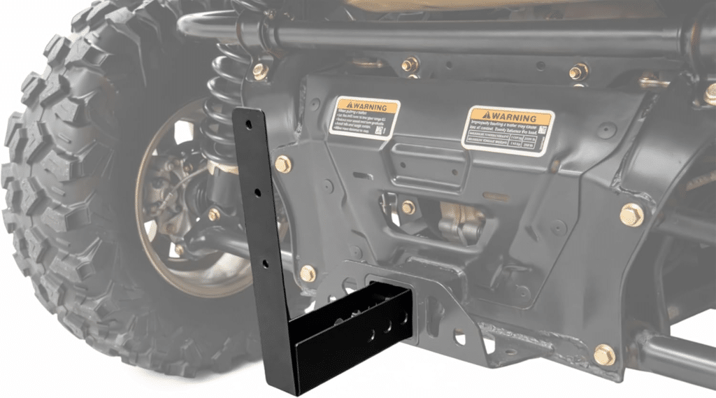In simple terms, it’s a sturdy bracket that attaches to the back of your UTV using a standard 2-inch hitch receiver. Its job is to securely hold a 14-inch SMV sign with a 6-inch bolt pattern so it stays visible at all times.
