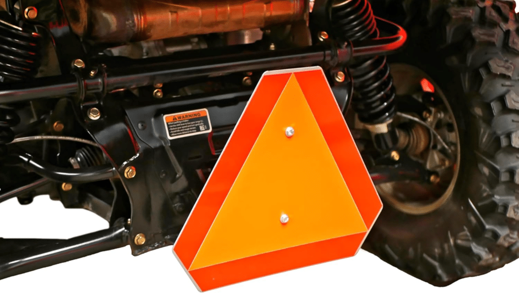 When you’re driving a UTV at slower speeds, especially on shared roads, other drivers may not realize how slowly you’re moving. A bright reflective SMV sign gives them a clear warning from a distance.